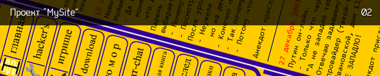 Мой первый личный сайт. Создавался исключительно ради интереса и для себя, ручками в блокноте. Вёрстан на фреймах, с использованием скриптов и флеша. Так как в те далёкие романтичные диал-ап времена считалось хорошим тоном делать сайты максимально лёгкими — мною была проведена чудовищная работа по оптимизации в результате чего проект стал занимать чуть более 400кб вместе с графикой, флешем и звуком. Можно кликнуть и убедиться.