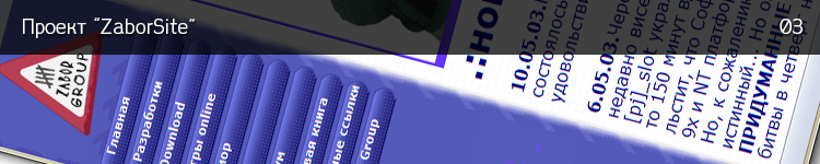 Довольно объёмный сайт существовавшей в те времена созданной мной творческой группы разработчиков "Zabor Group". Сделан с любовью, онлайн играми, чатом, гостевой книгой и т.д. Особенно рекомендую зайти в до сих пор корректно работающий раздел игр и приобщиться к чудесным творениям онлайн флеш развлечений тех далёких лет.