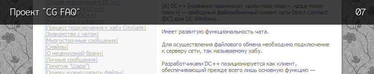 Проект "CityGate FAQ" создавался для местного интернет-провайдера и представляет из себя список ответов на наиболее часто задаваемые пользователями вопросы касательно клиента DC++ и процесса работы с ним. Интерактивное оглавление и подробные пошаговые иллюстрации призваны вывести FAQ на более дружелюбный уровень по отношеню к пользователю, в сравнении с обычными сухими и скучными инструкциями.