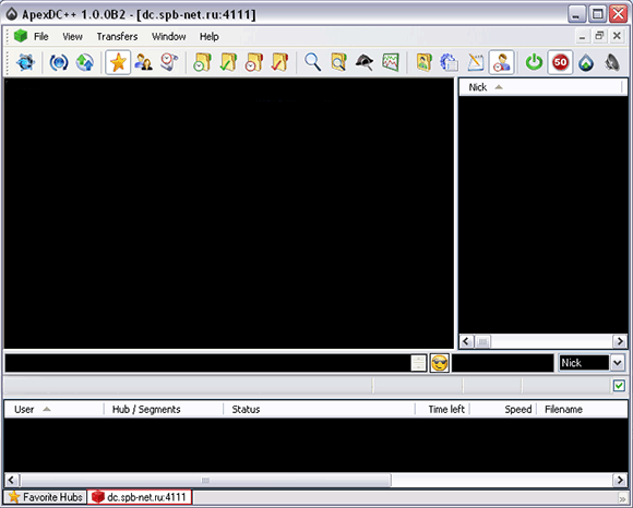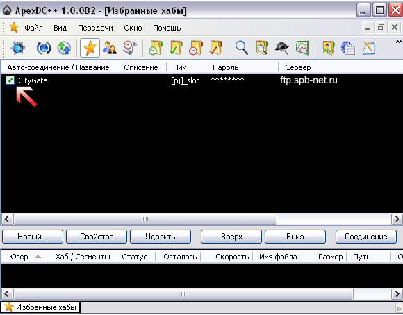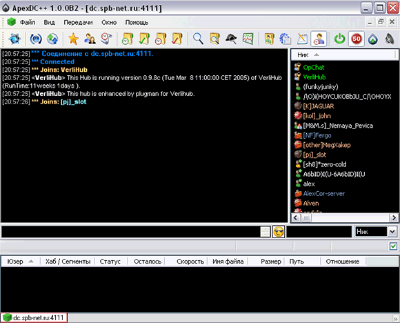 Как можно заметить - появилась строчка со свежесозданным хабом. Убедитесь, что слева от неё стоит галочка - это позволит автоматически подсоединяться к хабу при запуске ApexDC++. Теперь мы готовы к первому подключению - для этого просто два раза кликните на строку с избранным хабом либо нажмите на кнопку "Соединение" справа внизу. Если вы всё проделали правильно то окно программы должно приять примерно следующий вид: