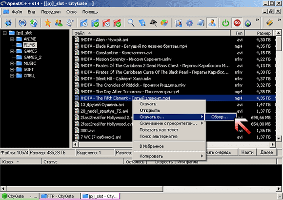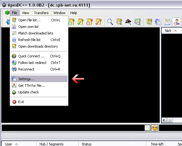 Есть два способа его скачать - кликнуть на файле или папке два раза - в этом случае файл сразу начнет скачиваться в папку установленную поумолчанию. Как правило это чтото вроде "C:\Program Files\ApexDC++\Downloads\". Чтобы изменить папку для закачек - зайдите в "Файл -> Настройки" и там выберите пункт "Скачивание". В появившихся справа настройках можно установить новую папку для закачек путем нажатия кнопки "Обзор". Если же вы хотите скачать файл или папку в отличное от установленного по умолчанию место то нажмите на файле правой кнопкой и выберите "Скачать в... -> Обзор..." и выберите локацию для скачки. [Q] Мм.. кажется у меня проблема. Я кликаю два раза на нике человека, но ничего не происходит - его список файлов не открывается. В чем может быть дело.