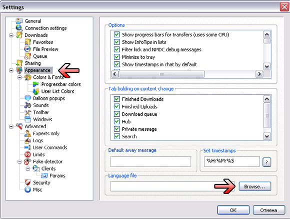 В открывшемся меню настроек выберите в левом столюбце строку "Appearance". После этого в правой нижней части меню, напротив поля "Language file" нажмите на кнопку "Browse".