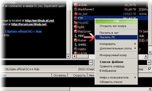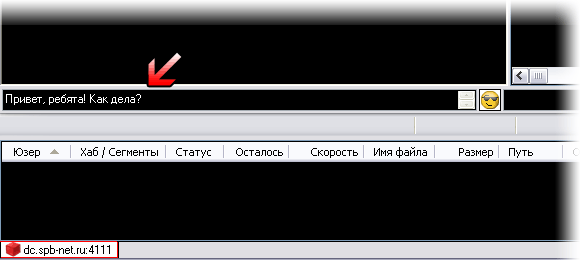 Как видно - в левой части окна появилось сообщение о подключении к хабу, его версия и еще некоторая информация. В правой же части можо увидеть список пользователей пребывающих в данный момент онлайн. Собственно это и есть окно главного чата. [Q] Люблю чаты! Я уже хочу поприветствовать товарищей из сети! Куда тут писать? [A] Пишите своё сообщение в вот это поле. Для отправки нажмите Enter. На разных хабах встречаются разные ограничения на длину сообщения и на частоту отправки сообщений подряд от одного пользователя (для защиты от флуда) но эти ограничения достаточно велики и не помешают обычному общению.