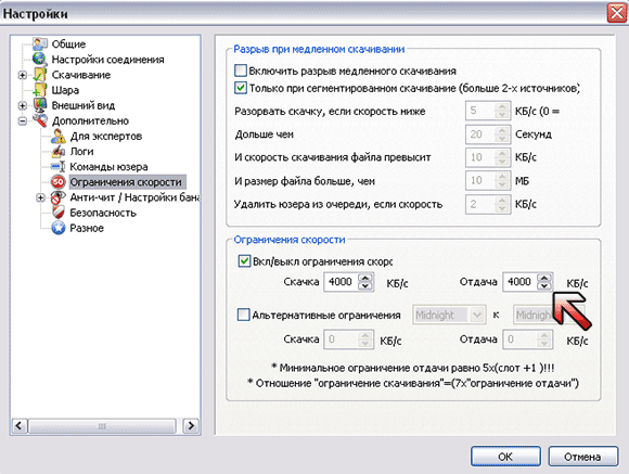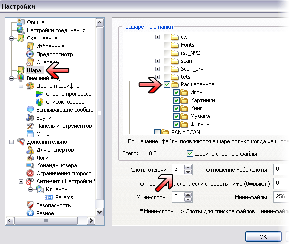 Обратите внимание, что расшаривать можно только папки с файлами. Файлы поотдельности расшаривать нельзя. Так же обратите внимание, что после установки галочки расшарятся только файлы в этой папке, но не подпапки. Чтобы расшарить папку на всю глубину и со всеми подпапками необходимо ставить галочку, удерживая нажатым Ctrl. После установки галочки вам предложат возможность дать папке название отличное от того какое она имеет на жестком диске. Старайтесь называть папки понятно. Еще один важный момент - переведите взгляд чуть ниже - на поле с надписью "слоты отдачи". Это число обозначает число пользователей которые смогут одновременно скачивать с вас файлы. Установите по желанию - в зависимости от своих амбиций и аппаратных возможностей. Теперь нажмите ОК. Подождите пока закончится хеширование файлов - если их много - это может занять некоторо время. Хеширование - это процесс получения хеша файла - некоего кода, идентифицируещего файл в сети. Хеш файла можно сравнить с отпечатками пальцев. Именно по хешу DC++ будет опознавать файлы при проведении операций поиска и закачек. [Q] А если я добавлю какието файлы в расшаренную папку - они автоматически подключатся к шаре или надо будет перерасшаривать всю папку заново? [A] Файлы автоматически подключатся в шаре через некоторое время, однако будет лучше, если вы форсируете обновление своей шары нажатием Ctrl+E. [Q] Ага, всё расшарилось. И, кажется, с меня уже качают. Такой вопрос - иногда мне кажется, что изза большой нагрузки во время скачивания с меня файлов у меня начинает тормозить компьютер. Скажите, можно ли както ограничить скорость отдачи? [A] Да, это возможно. Для этого зайдите в меню настроек (Файл -> Настройки) и там в списке пунктов слева выберите пункт "Дополнительно" и в нём подпункт "Ограничения скорости".