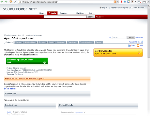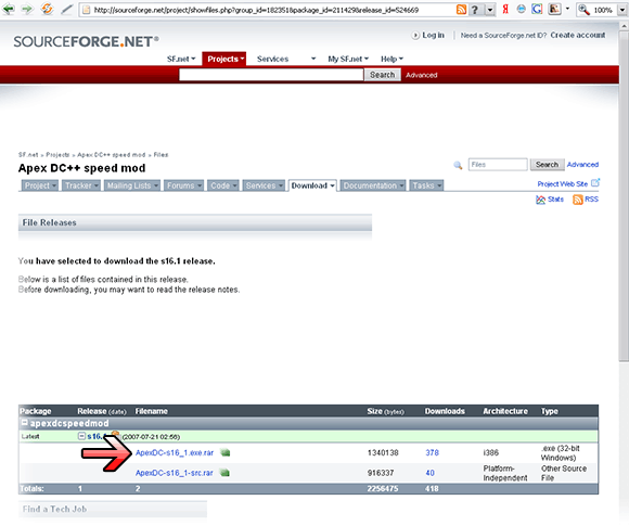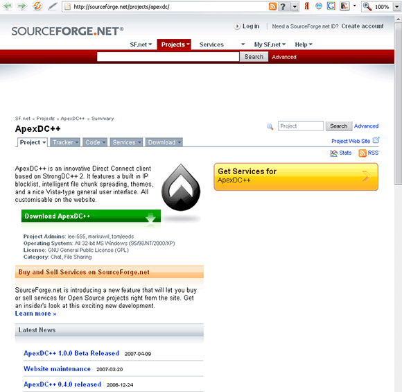 клиент сети Direct Connect (DC) для ОС Windows. [Q] Интересно. Получается существует множество модифицированных клиентов с расширенной функциональностью? Может присоветуете какой-нибудь? [A] Конечно. Могу порекомендовать ApexDC++ - весьма качественный и достаточно простой клиент. [Q] Отлично! А откуда его можно скачать?) [A] Скачать можно много откуда, но я бы рекомендовал брать его с официальной странички, которая располагается по адресу http://sourceforge.net/projects/apexdc/. Давайте взгянем на то что предстанет нашему взору, когда мы перейдем по этой ссылке.