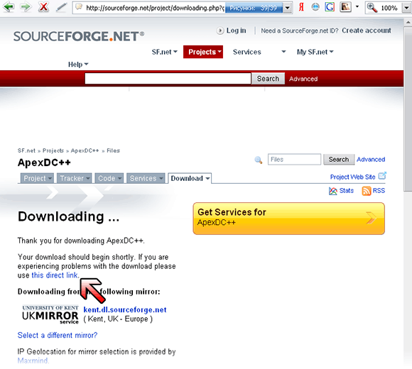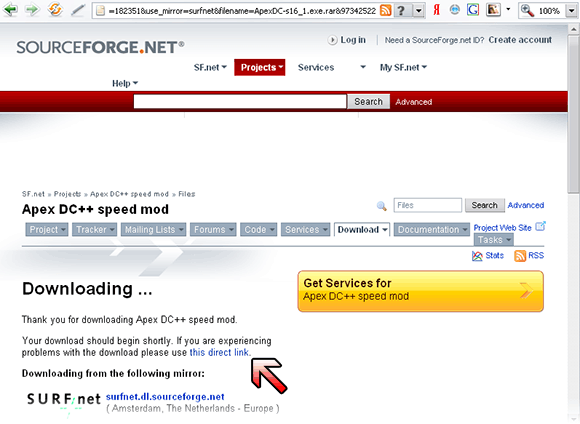 Откроется сдедующее окно и загрузка начнется автоматически. Если загрузка по каким-то причинам не стартовала автоматически - можно воспользоваться прямой ссылкой находящейся на вновь открытой странице. Теперь, когда вы скачали установочный файл - просто запустите его и установите программу - установка ничем не отличается от большинства обычных програм и не должна вызвать затруднения. [Q] Так. Я установил ApexDC++ и даже запустил его. Выглядит сложновато, да еще и на английском. Это можно как-нибудь исправить?